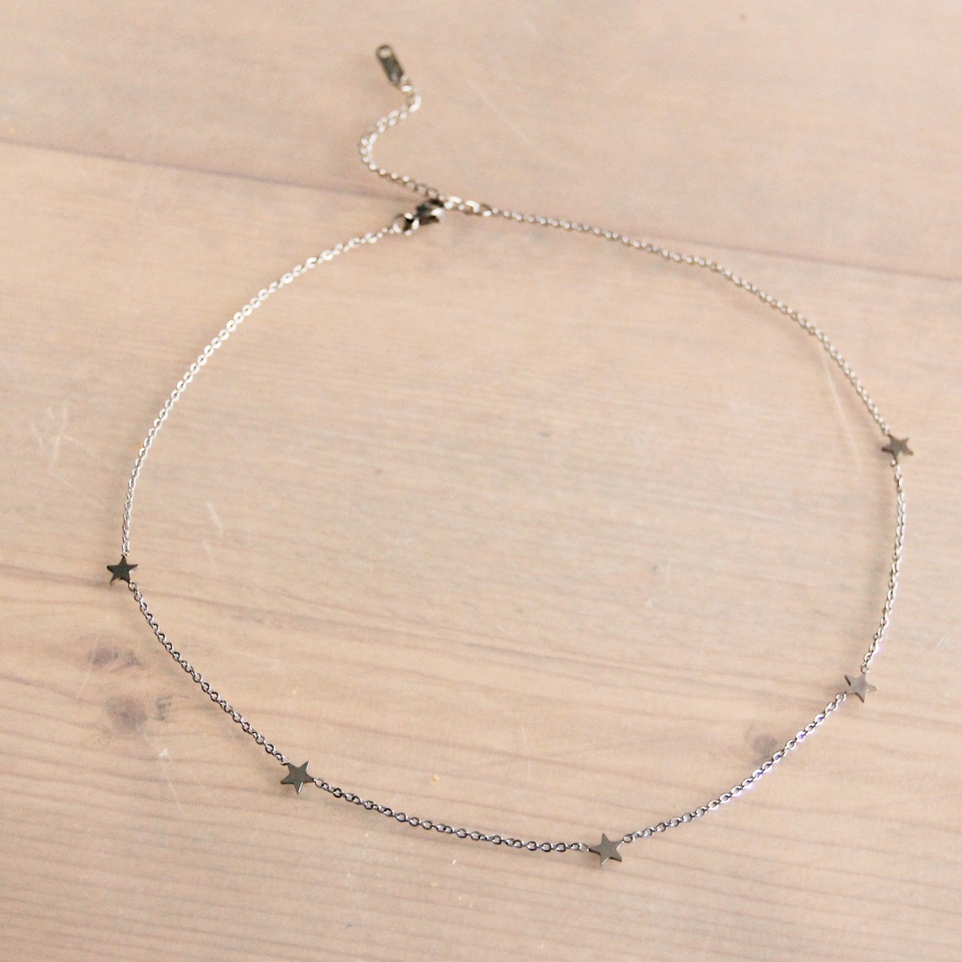 Korte ketting met 5 zilverkleurige sterren eraan.